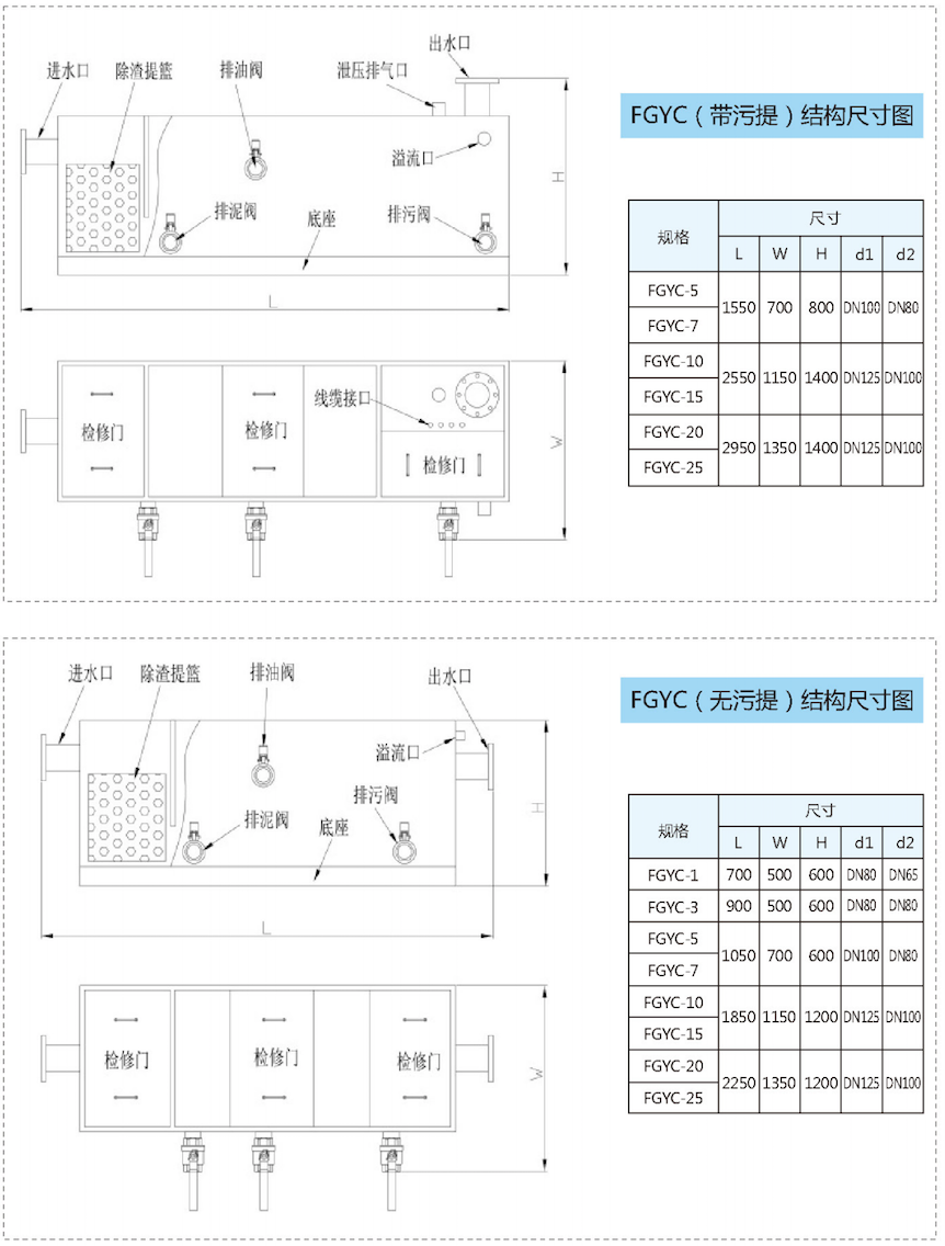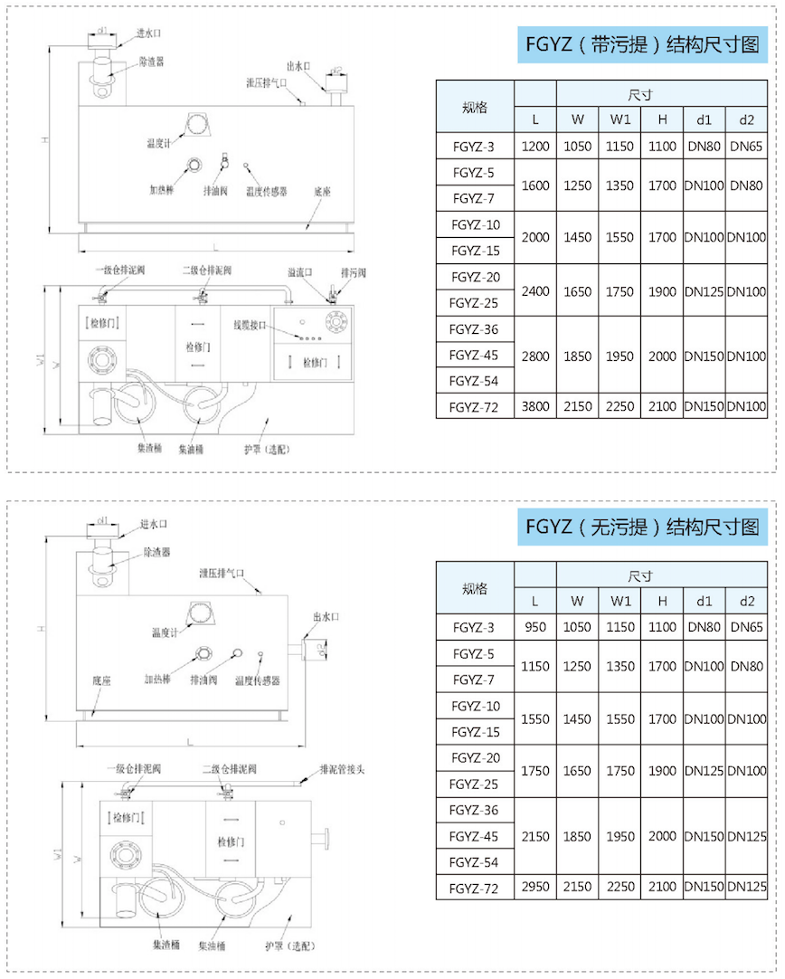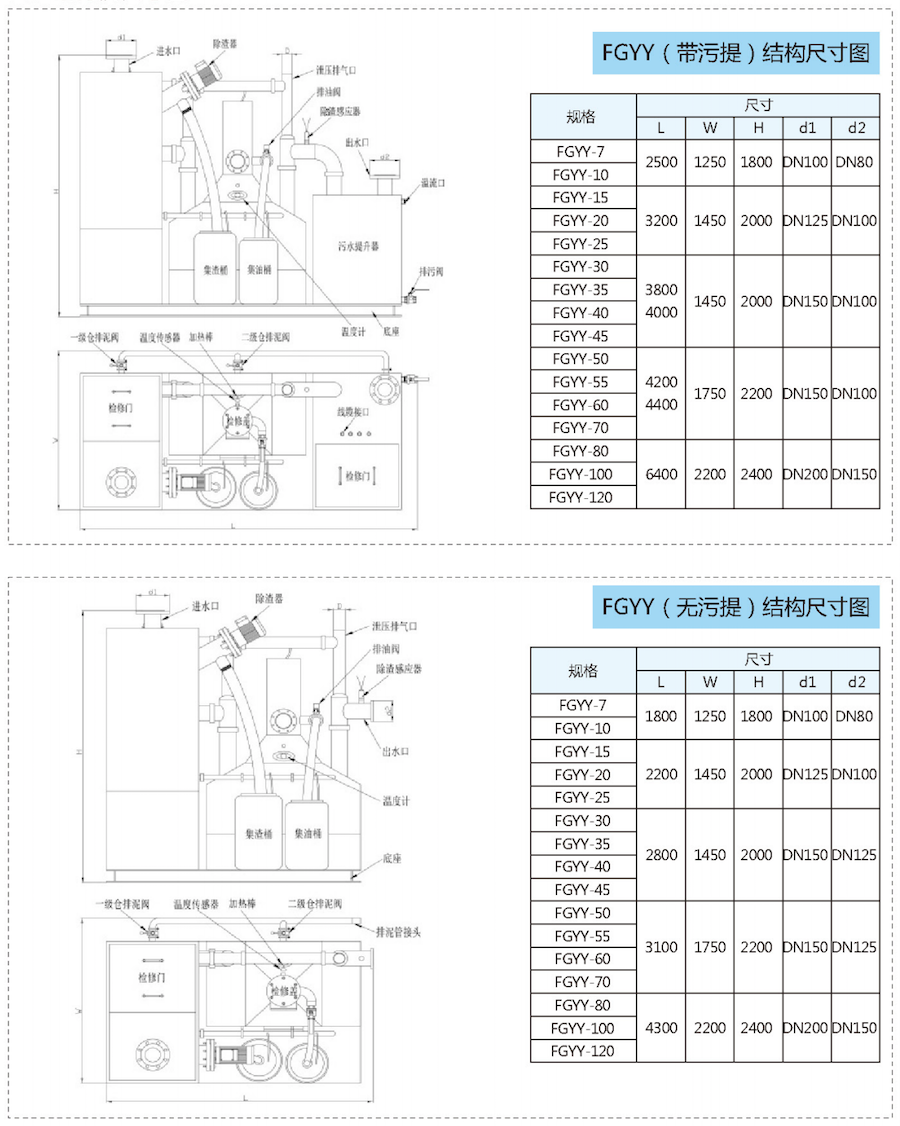采用模块化设计,将独立除渣沉降仓、油水分离仓、通气桥、管阀构件、电控系统连为一体,可一站式实现除渣、油水分离和污水提升的功能,也可根据实际需求加上污水提升模块:采用特殊锥形收集装置可以最有效收集油脂及排除沉泥.